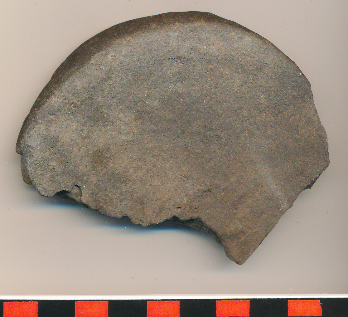 Fekete, homokos anyagú, korongolt edény vágott alja a felmenő fal kicsi csonkjával.