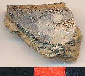 Sárga, kívül-belül fényezett felületű, kevés kerámiazúzalékkal soványított, kívül fekete foltos edény kissé elvékonyodó, lekerekített apró peremtöredéke.