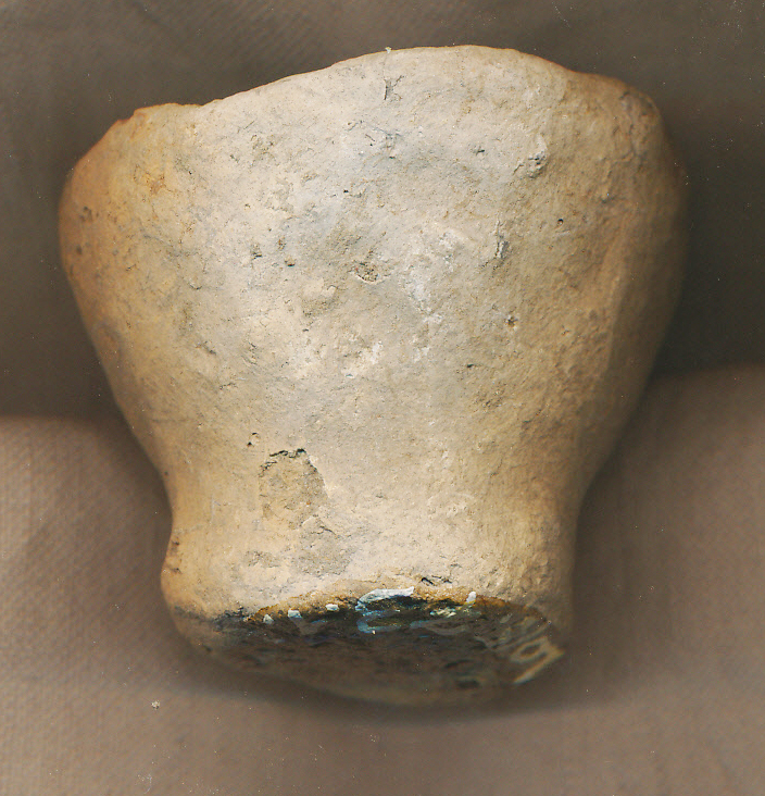 Világos szürkés téglaszínű, kevés kerámiazúzalékkal soványított, korong nélkül készített csonkakúpos miniatűr edény elvékonyodó peremmel, profilált, vágott aljjal.