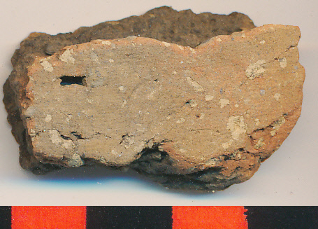 Téglaszínű külső-belső, eldolgozott felületű, fekete törésű, kerámiazúzalékkal soványított kisebb oldaltöredék.