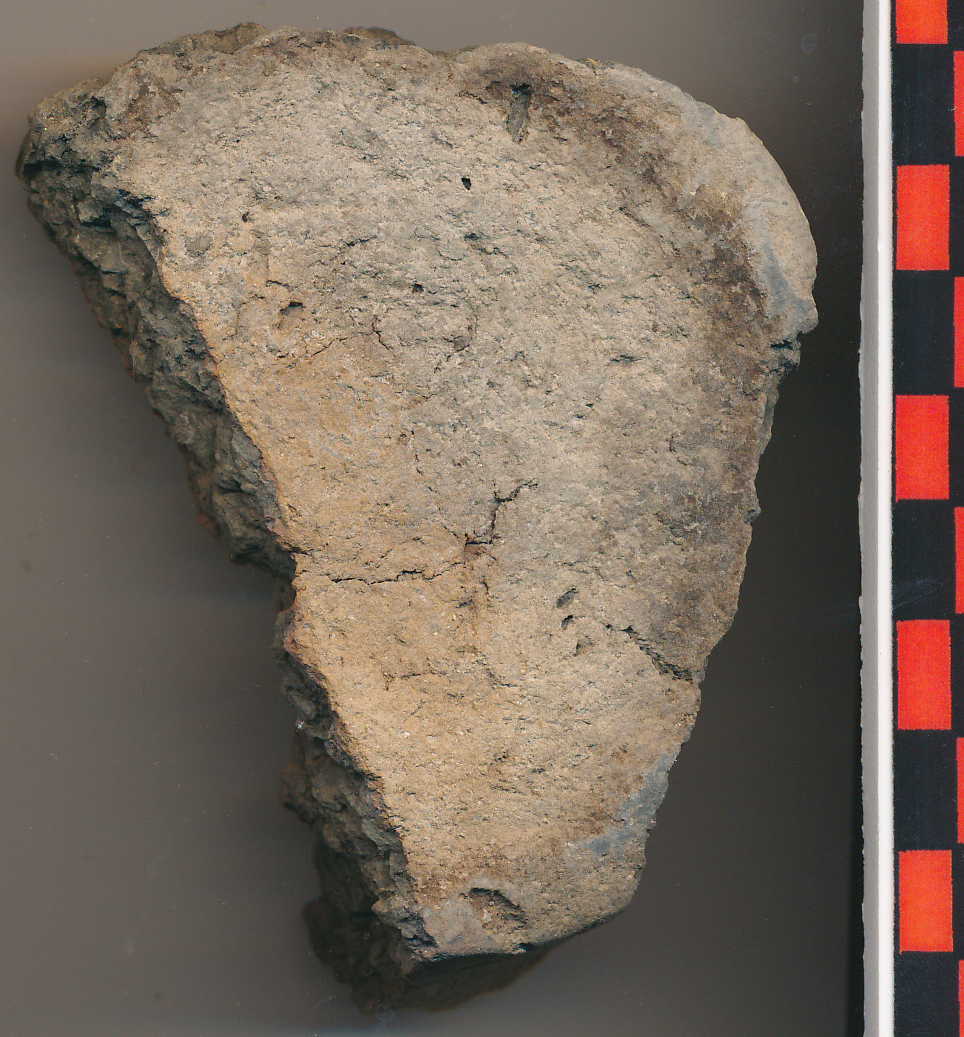 Téglaszínű külső-belső felületű, kívül fekete foltos, fekete törésű, kerámiazúzalékkal soványított anyagú, korong nélkül készített kisebb edény vágott aljtöredéke ívelten induló felmenő fal csonkjával.