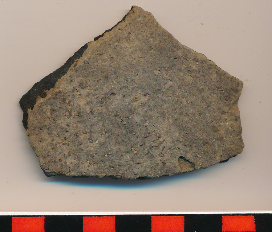 Szürke külső felületű, fekete törésű, homokos anyagú, korongolt, vékony falú , kopott oldaltöredék.