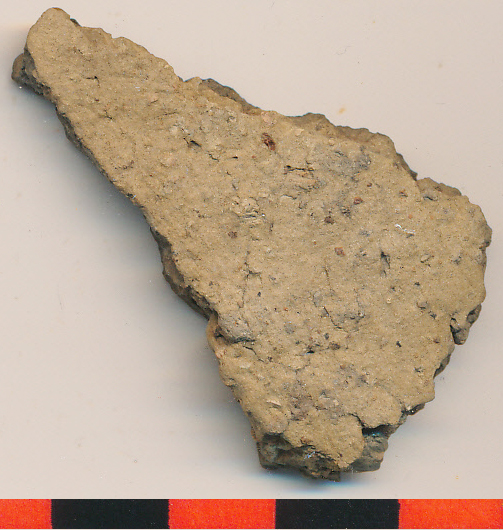 Sárga külső felületű, fekete törésű, kerámiazúzalékkal erősen soványított, érdes felületű kisebb oldaltöredék.