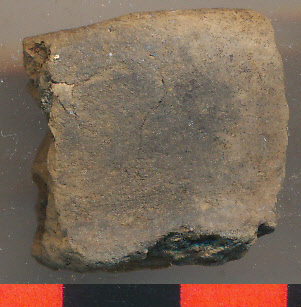 Sárga, külső felületén fekete foltos, kevés kerámiazúzalékkal soványított, ferdén kifelé tartó, legömbölyített pereme, mintha indulna az alja is. Ha ez így van, akkor igen lapos kis tányér lehetett.