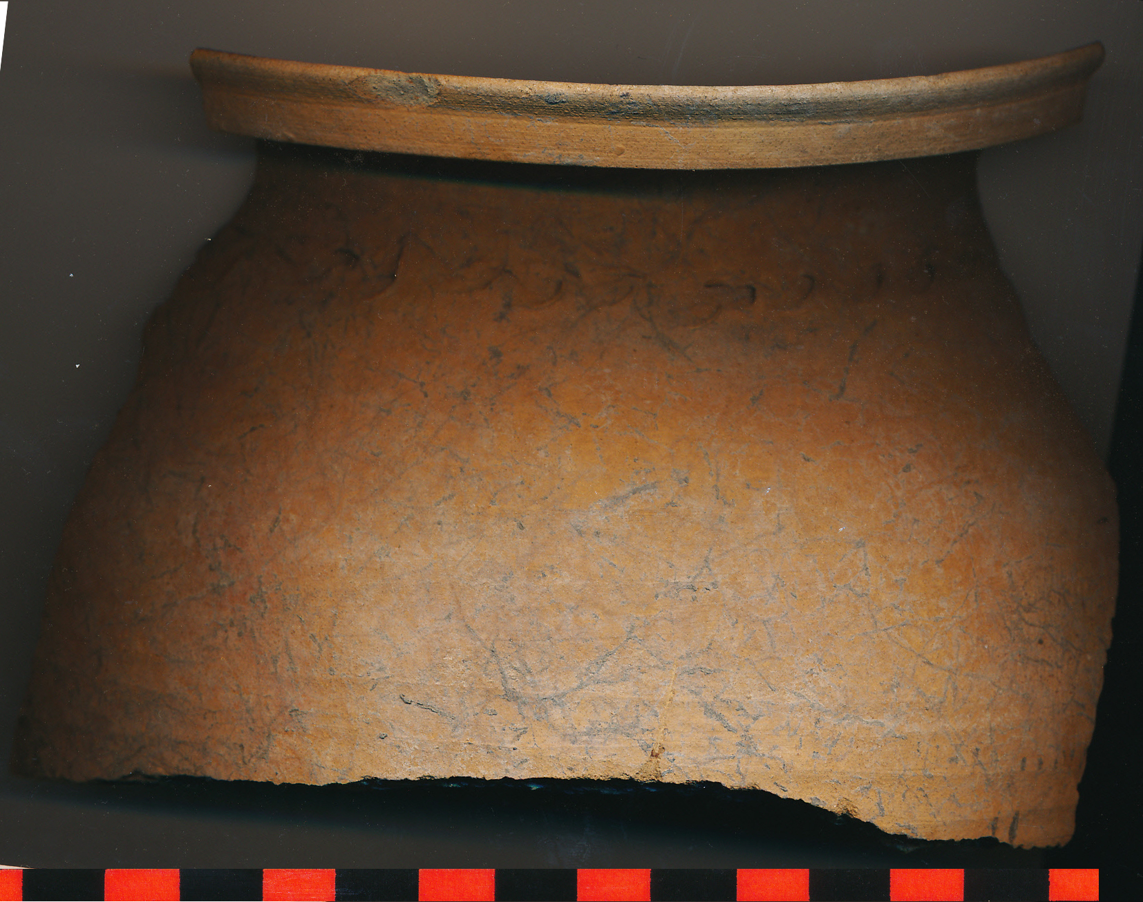 Világos téglaszínű, homokkal soványított, korongolt nagyobb fazék kihajló, függőlegesen vágott, enyhén kívülről tagolt peremű, íves nyakú, gömbölyű vállú nagyobb töredéke a nyak tövénél szabálytalan körbefutó bekarcolt hullámvonal.