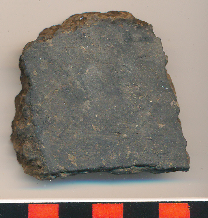 Fekete, kívül-belül polírozott, kerámiazúzalékkal soványított nagyobb edény oldaltöredéke.