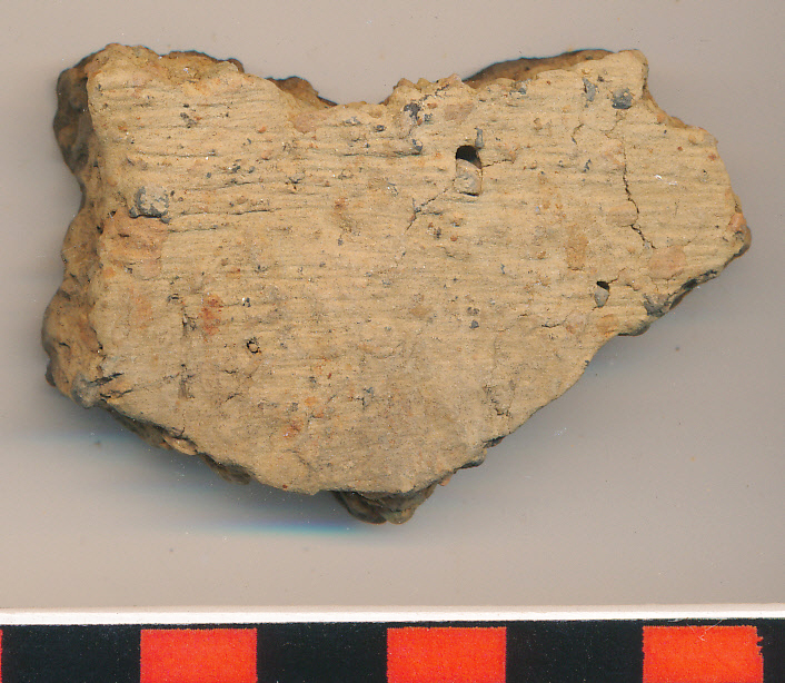 Téglaszín, érdes külső felületű, fekete törésű, belül polírozott, kerámiazúzalékkal soványított nagyobb edény oldaltöredéke.