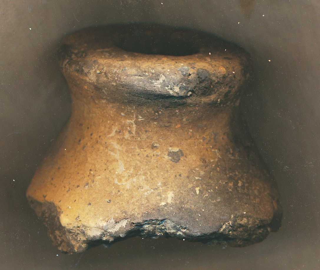 Téglaszínű, fekete foltos külső felületű, belsejében sárágs, fekete törésű, kevés kerámiazúzalékkal soványított, korong nélkül készített vastag falú, nehéz nagy fedő profilált, felülről benyomott fogója. átm: 5,6 cm.