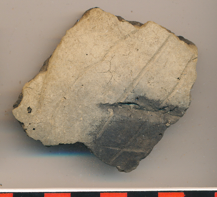 Kívül eldolgozott, fekete foltos sárga felületű, fekete törésű, belül is eldolgozott oldaltöredék, 4 szabálytalanul karcolt vonallal.