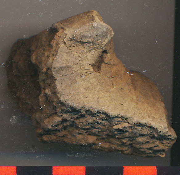 Piszkosszürke, piszkossárga foltos, kerámiazúzalékkal erősen soványított, durvább kidolgozású, vastag falú edény legömbölyített pereme, a perem alatt vízszintes középen benyomott lapos, téglalap alakú bütyökkel(?).