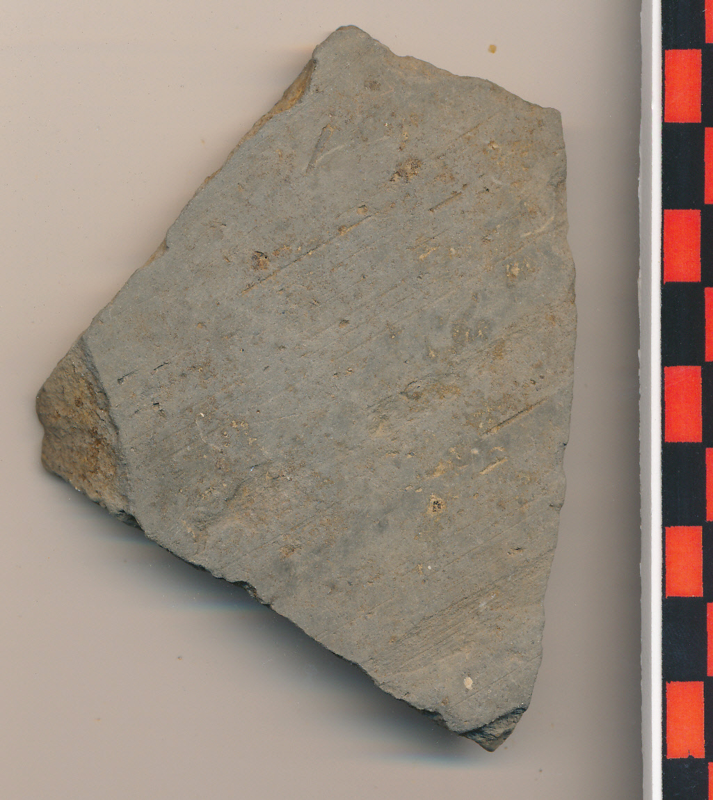 Szürke, korongolt edény külső felületén korongolási karcos, belül letöredezett felületű, vastagabb egyenes oldaltöredéke.