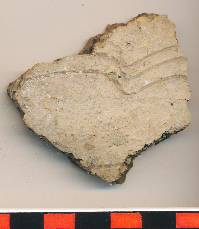 Kívül-belül eldolgozott,drapp felületű, szürke törésű oldaltöredék szabálytalanul behúzott enyhén hullámos vonalköteggel.