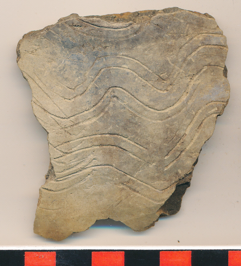 Kívül fényezett, belül eldolgozott, drapp felületű, fekete törésű vékony oldaltöredék bekarcolt körbefutó hullámos vonalakkal.
