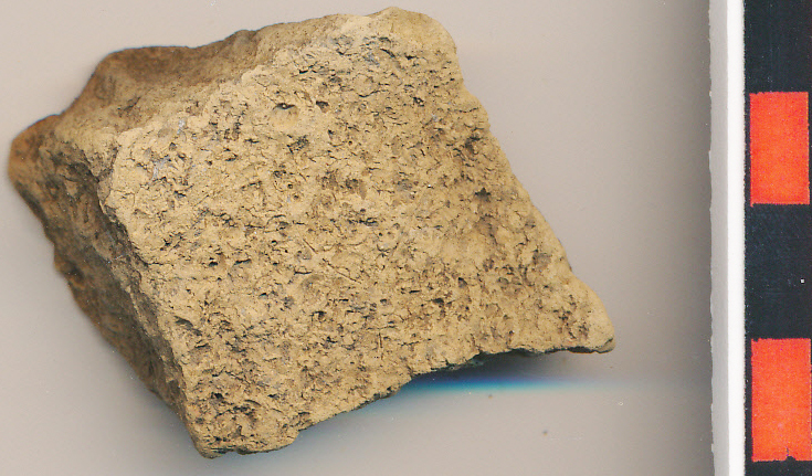 Kívül-belül drapp, szürkés törésű edény vágott, egyenes, kívül durvított aljtöredék felmenő fal nélkül.