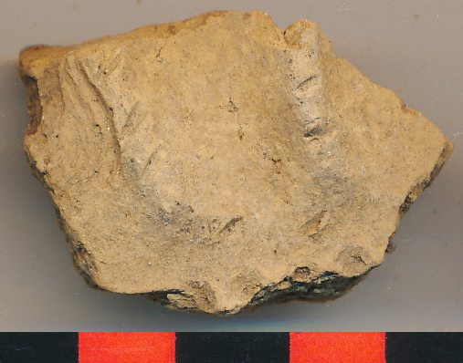 Világos téglaszínű, enyhén íves, vékonyabb falú oldaltöredék két, ferde kis bevágásokkal tagolt, függőleges plasztikus dísz felett vízszintes, plasztikus dísz indításával, illetve az egyik függőleges léc mellett szabálytalanul bekarcolt íves vonalköteggel.