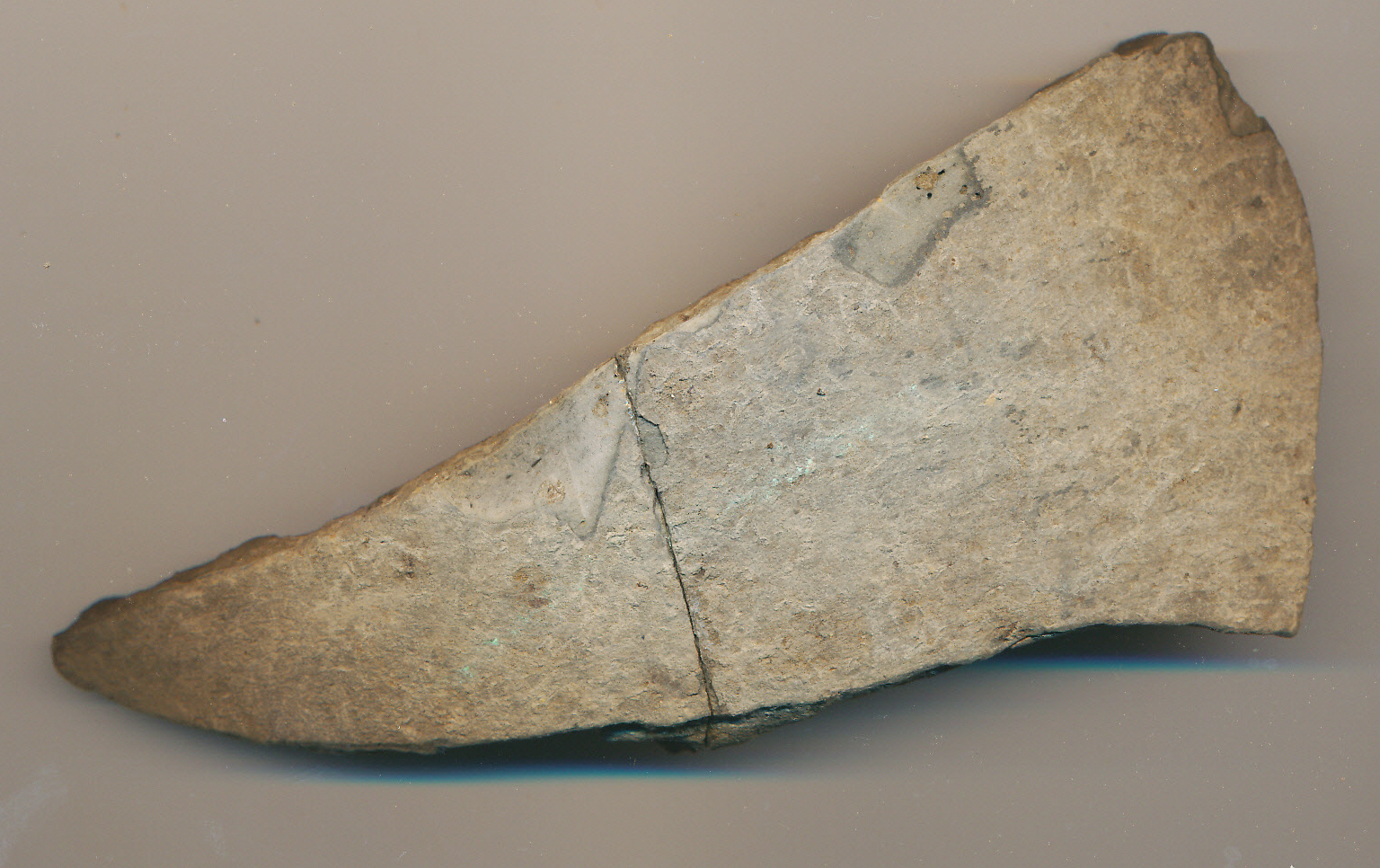 Sötétszürke, korongolt, vastag falú edény (hombár) íves, agyonkopott oldaltöredéke.