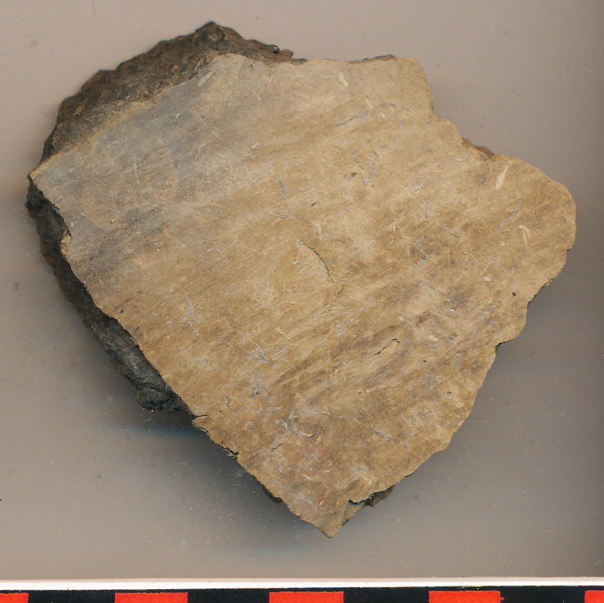 Kívül simított, belül eldolgozott világosbarna felületű, szürkésfekete törésű oldaltöredék.