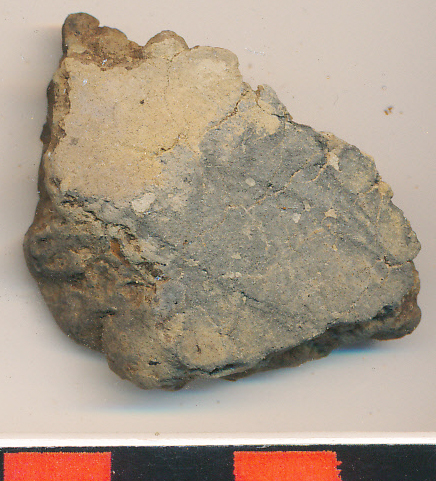 Sötétszürke, kívül sárga foltos, jellegtelen oldaltöredék.