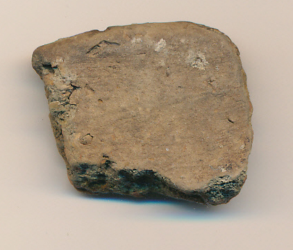 Drapp külső-belső felületű, szürke foltos, szürke törésű, kerámiazúzalékkal enyhén soványított, korong nélkül készített kisebb, vékony falú edény kihajló, legömbölyített peremtöredéke.