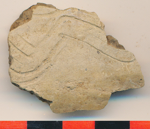 Fényezett drapp külső, elsimított téglaszínű belső felületű, fekete törésű, kerámiazúzalékkal soványított, vékonyabb oldaltöredék szabálytalanul karcolt cikkcakk köteggel.
