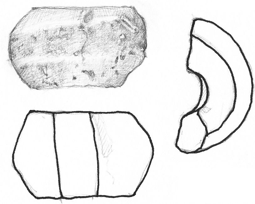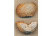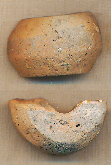 Téglaszínű, szürke foltos, homokos anyagú, korongolt, érdes tapintású bikónikus lapos orsógomb két egyforma félből, hengeres lyukkal.