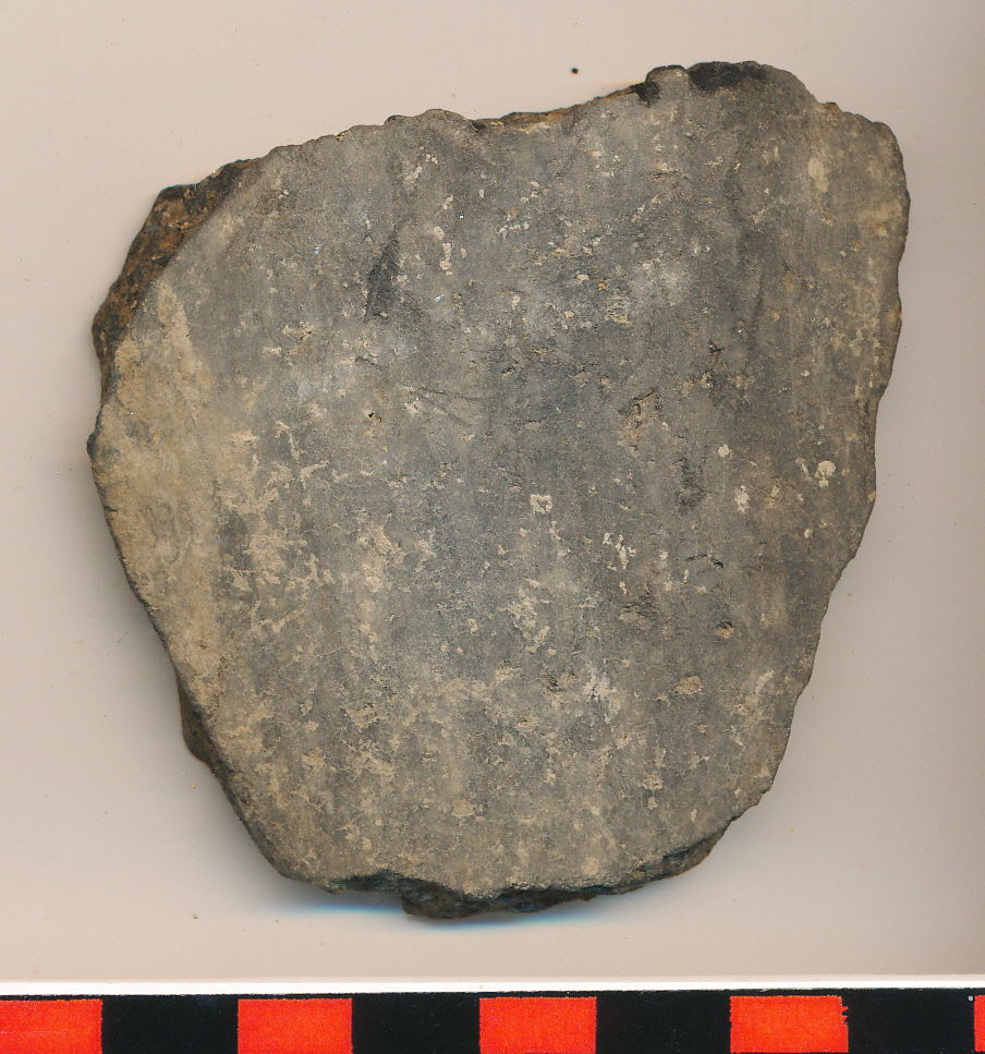 Sötétszürke külső-belső felületű, fekete törésű, kevés apró kerámiazúzalékkal soványított, kívül-belül eldolgozott felületű oldaltöredék.