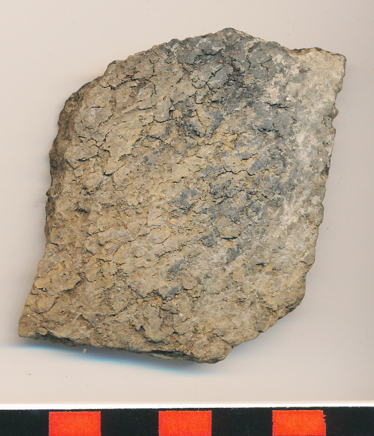 Sötétszürke, kívül téglaszínű foltos, fekete törésű, kevés apró kerámiazúzalékkal soványított, belül eldolgozott felületű oldaltöredék, melynek külső felülete rücskös, egyenetlen, talán másodlagosan égett?.