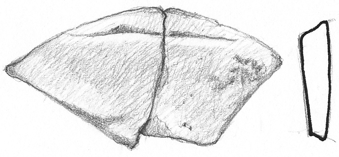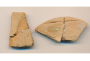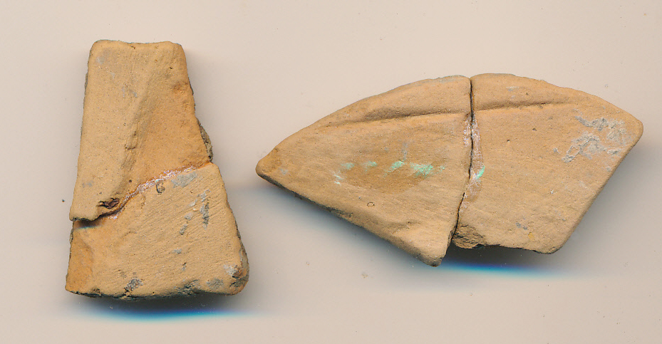 Világos téglaszínű, korongolt, vékony falú edények kopott két oldaltöredéke, az egyiken körbefutó bekarcolt vonallal.