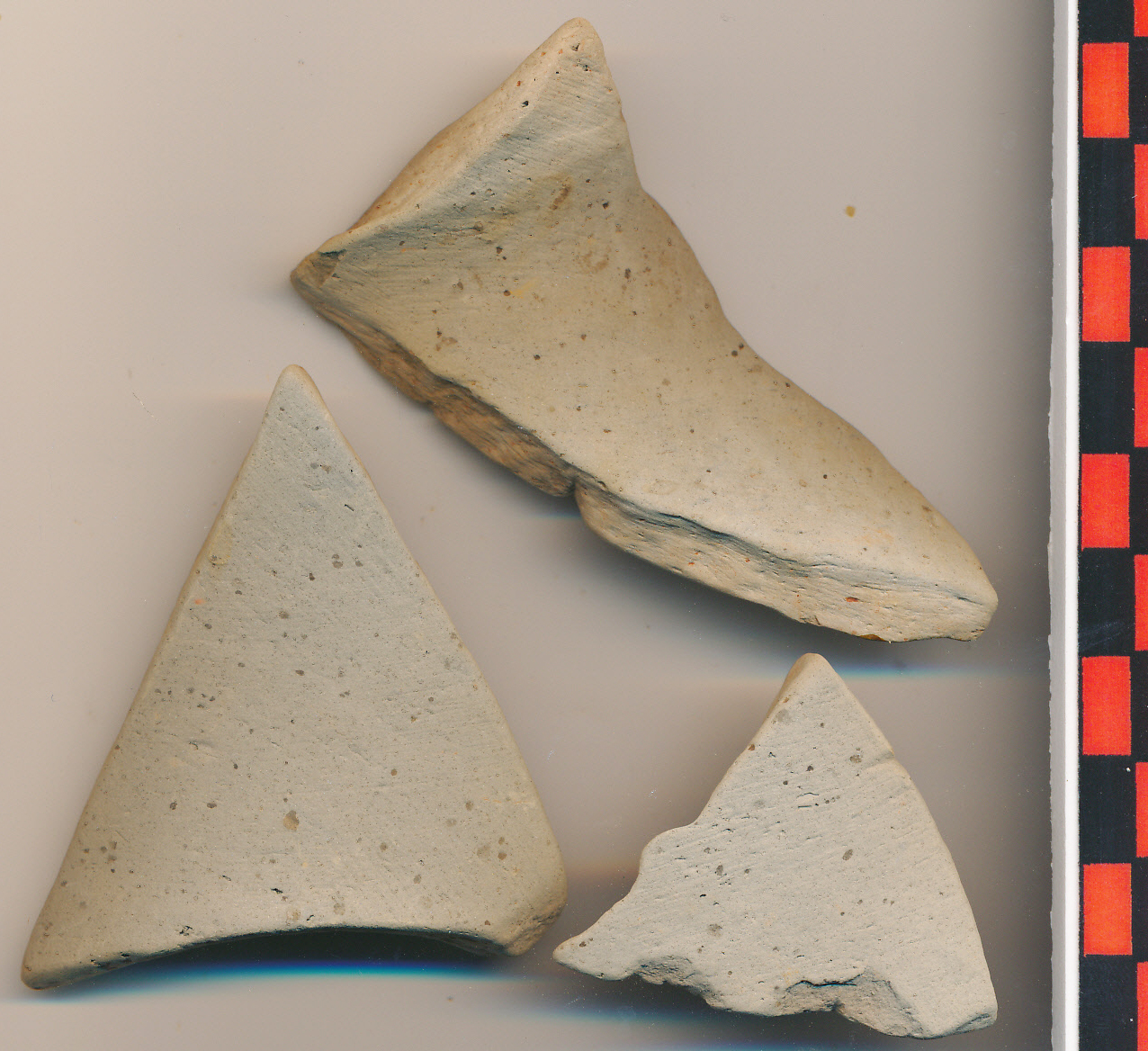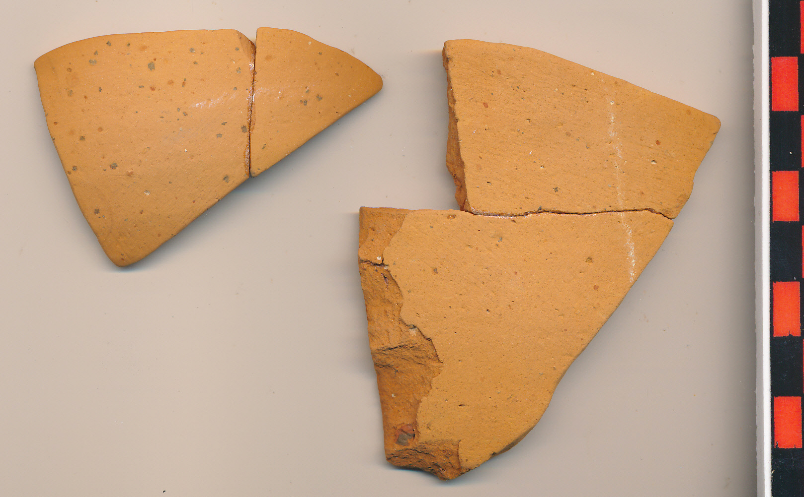 Szürkésdrapp, korongolt, puha anyagú edény 2 oldaltöredéke és egy íves nyaktöredéke alacsony bordával. Erősen kopottak.