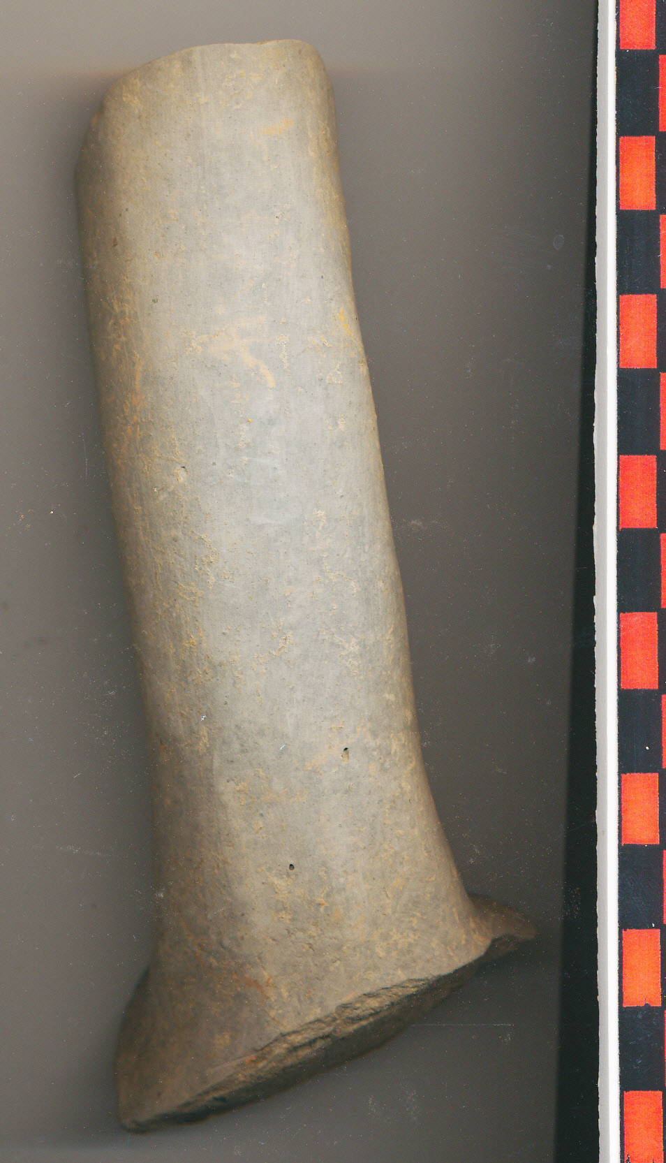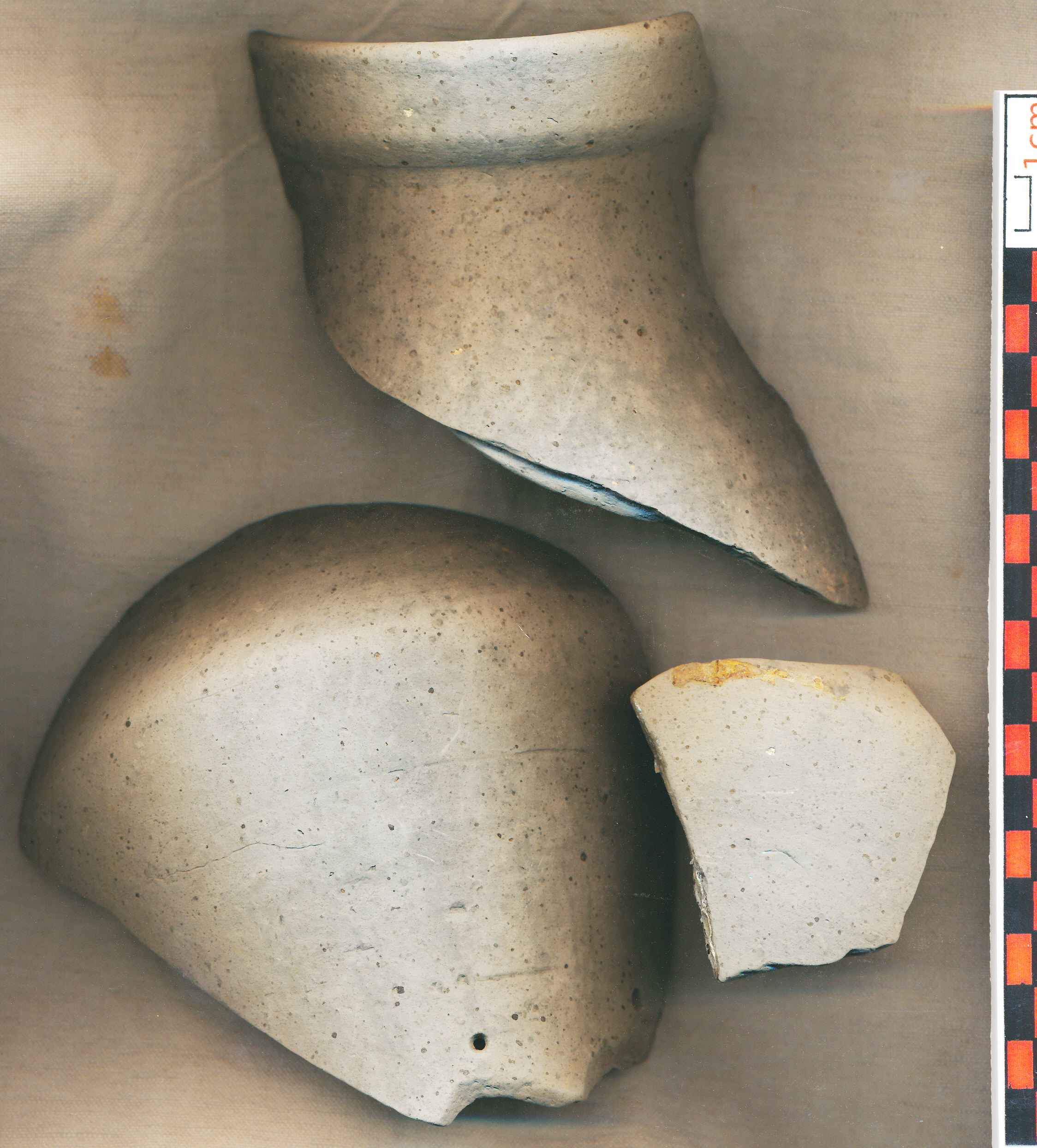 Világosszürke, korongolt, erősen kopott, párnás peremű, magas íves nyakú, erősen domborodó vállú edény - valószínűleg korsó - töredékei. Az egyik töredék 2 helyen átfúrt, 2 db-ból ragasztott.