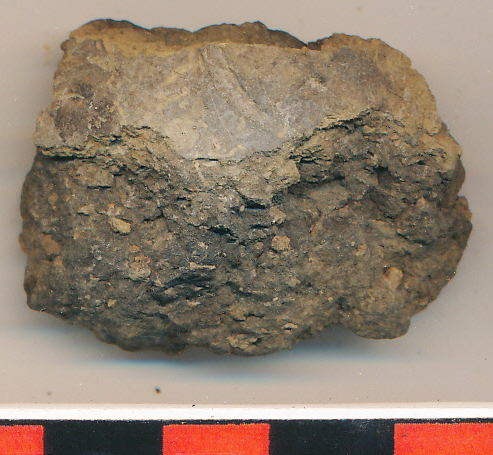 Piszkosszürke külső-belső felületű, fekete törésű, kerámiazúzalékkal erősen soványított edény vastagodó, letöredezett külsejű oldaltöredéke szabálytalanul karcolt vonal indításával.