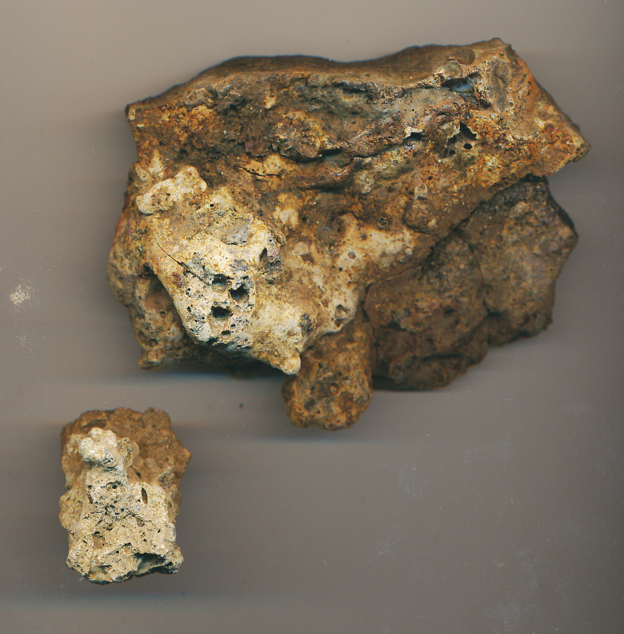 Egyik oldalán sima, homokos, a másikon szivacsos, szürke-sárga-barna foltos salak (talán vas?, bár nem annyira nehéz). Egyik széle mintha vágva lenne. (Egy hasonló kis darab leltári szám nélkül eltéve: anyagvizsgálatra használható.)