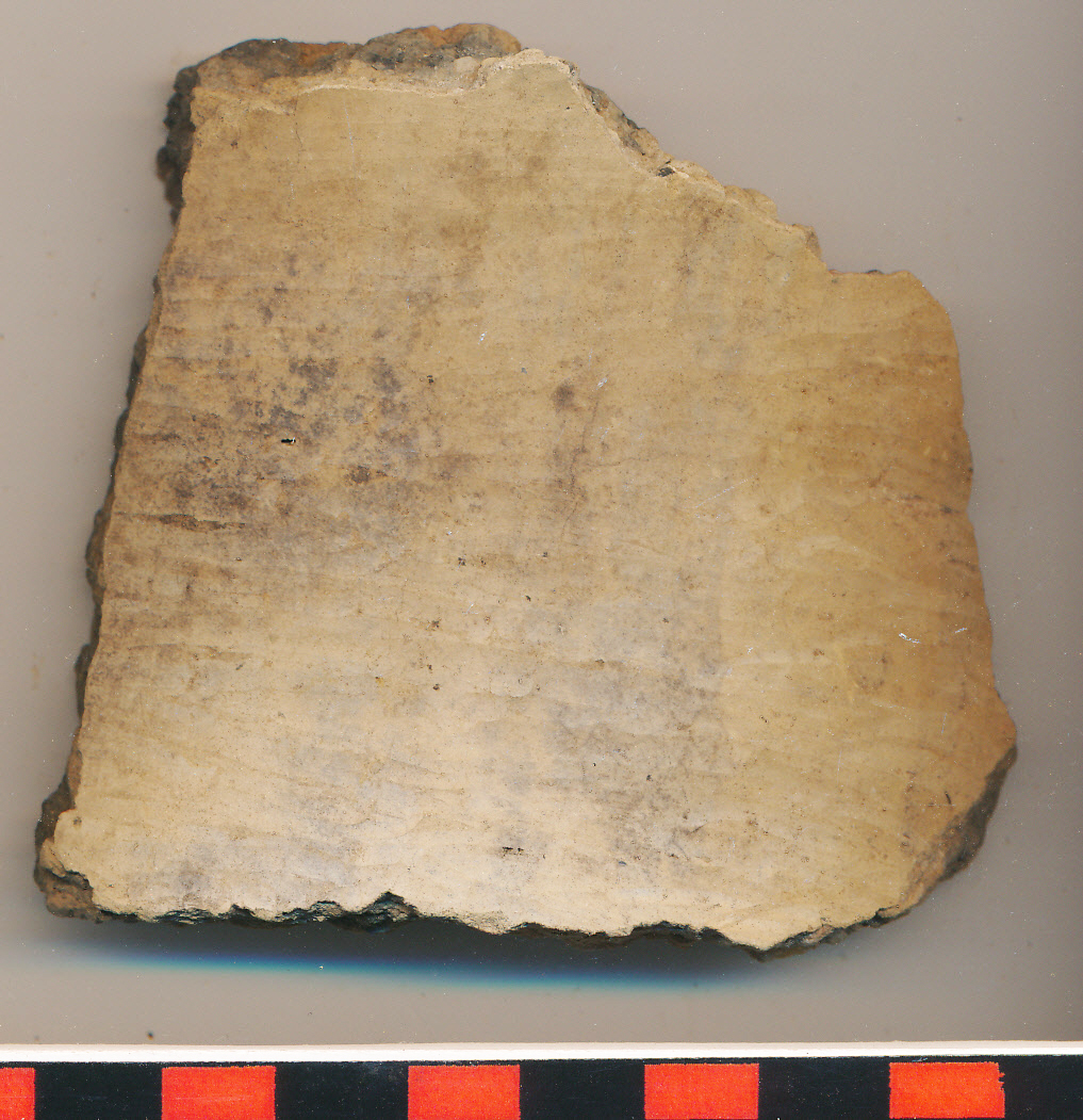 Sárga külső-belső felületű, kívül fényezett, fekete törésű, kevés kerámiazúzalékkal soványított, nagyobb edény íves nyakának töredéke.