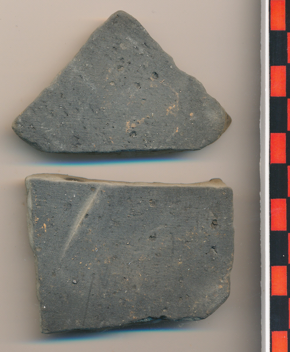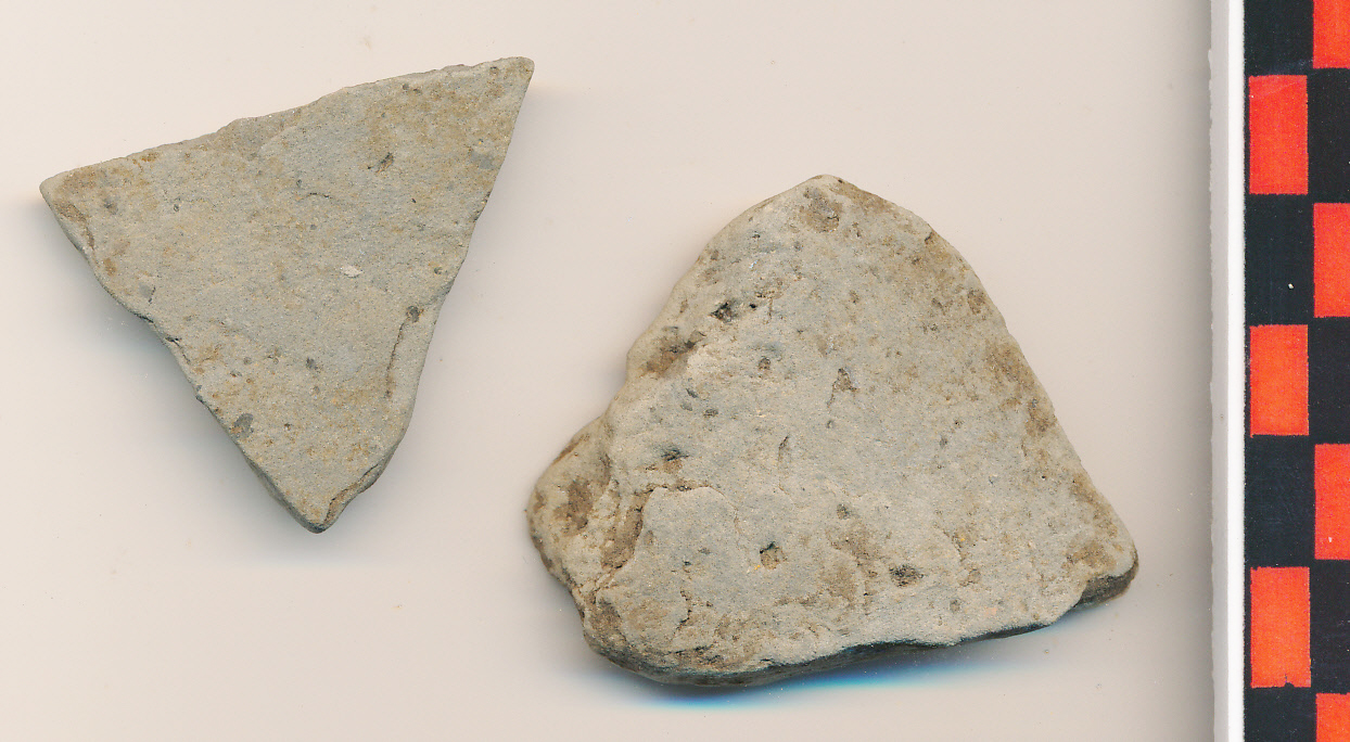 Világosszürke, külső felületén sötétszürke. korongolt, vastag falú, homokos anyagú, kopott két egyenes oldaltöredék.
