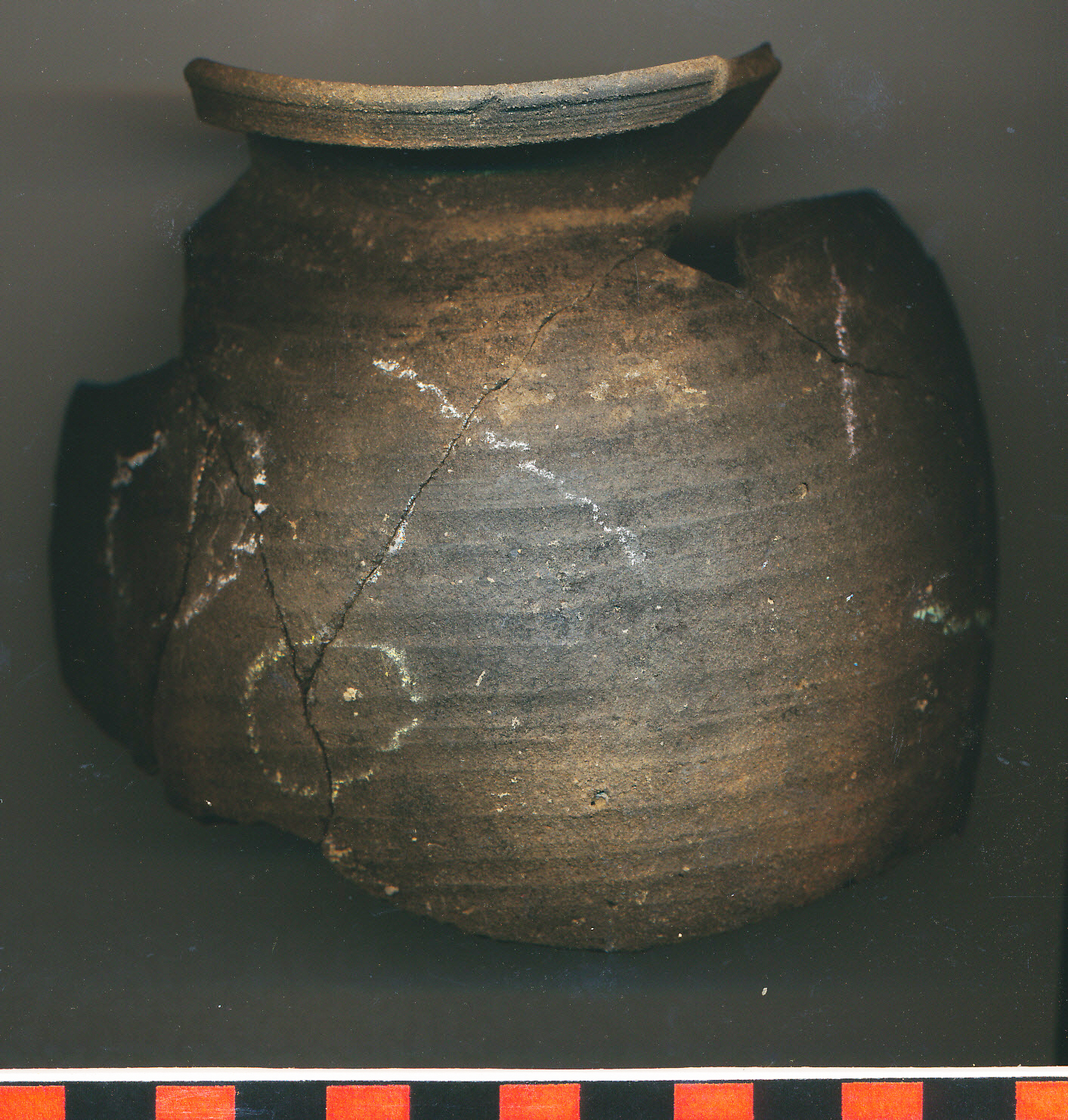 Fekete, erősen kihajló, enyhén ferdén vágott peremű, erősen íves nyakú, gömbölyű vállú, homokkal soványított, korongolt edény perem és válltöredéke, a vállon sűrűn vízszintesen benyomott vonalakból képzett díszítés. 6 db-ból ragasztott.