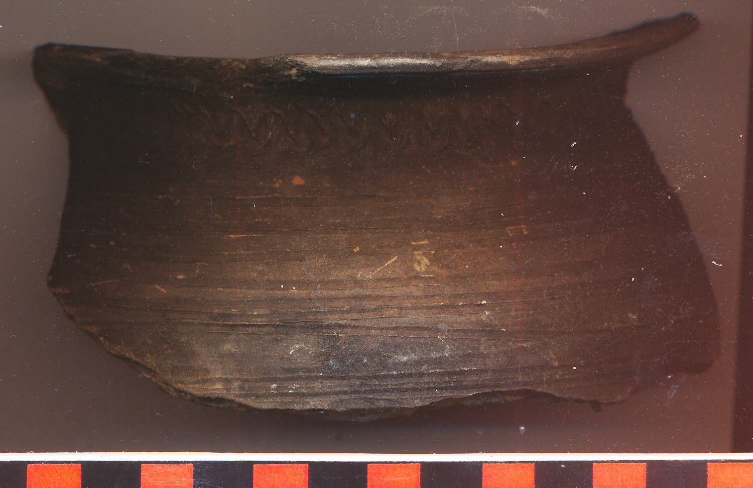 Fekete, korongolt fazék erősen kihajló peremű, íves nyakú, gömbölyded vállú töredéke, a nyak tövénél bekarcolt körbefutó vastag karcolt vonallal, a vállon alatta síűrű, szabálytalanul körülfutó karcolt vonalakkal.