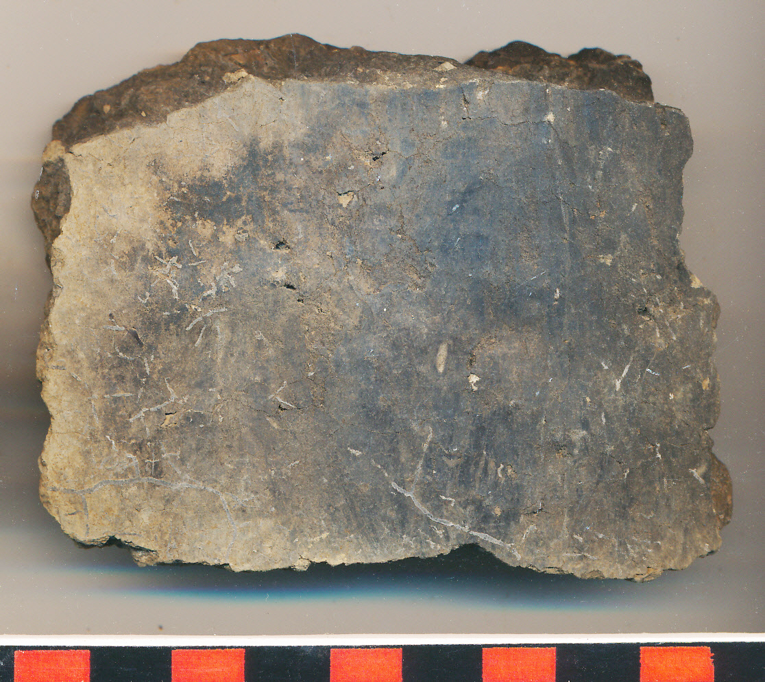 Fekete, vastag falú, kívül sárga foltos, belső felületén drapp, kerámiazúzalékkal erősen soványított, igen vastag falú oldaltöredék.
