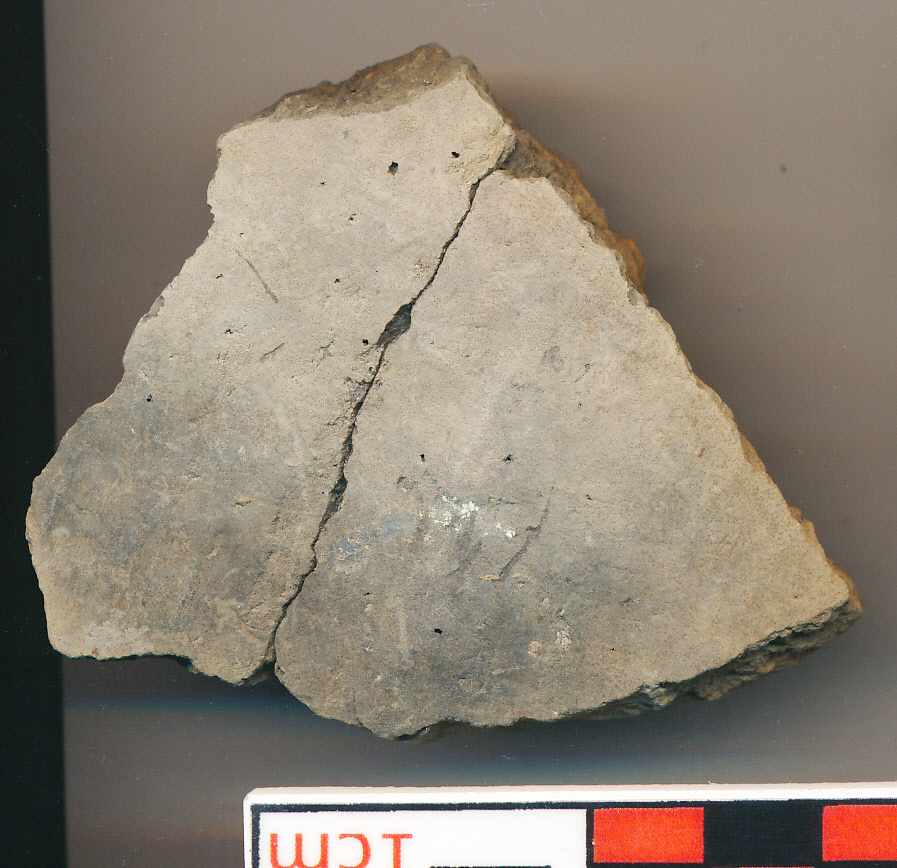 Kívül-belül elsimított szürke felületű, kívül fekete foltos, szendvicses törésű oldaltöredék 2 db-ból ragasztva.