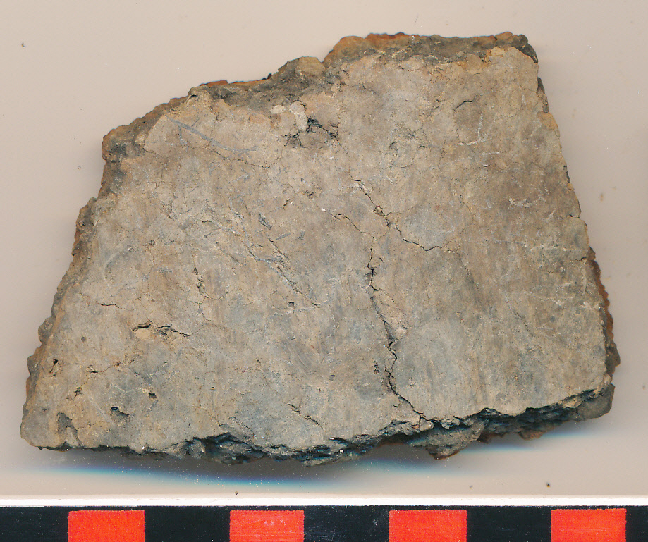 Kívül szürke, belül téglaszínű felületű, kerámiazúzalékkal erősen soványított, nagyobb edény vékonyabb falú oldaltöredéke.