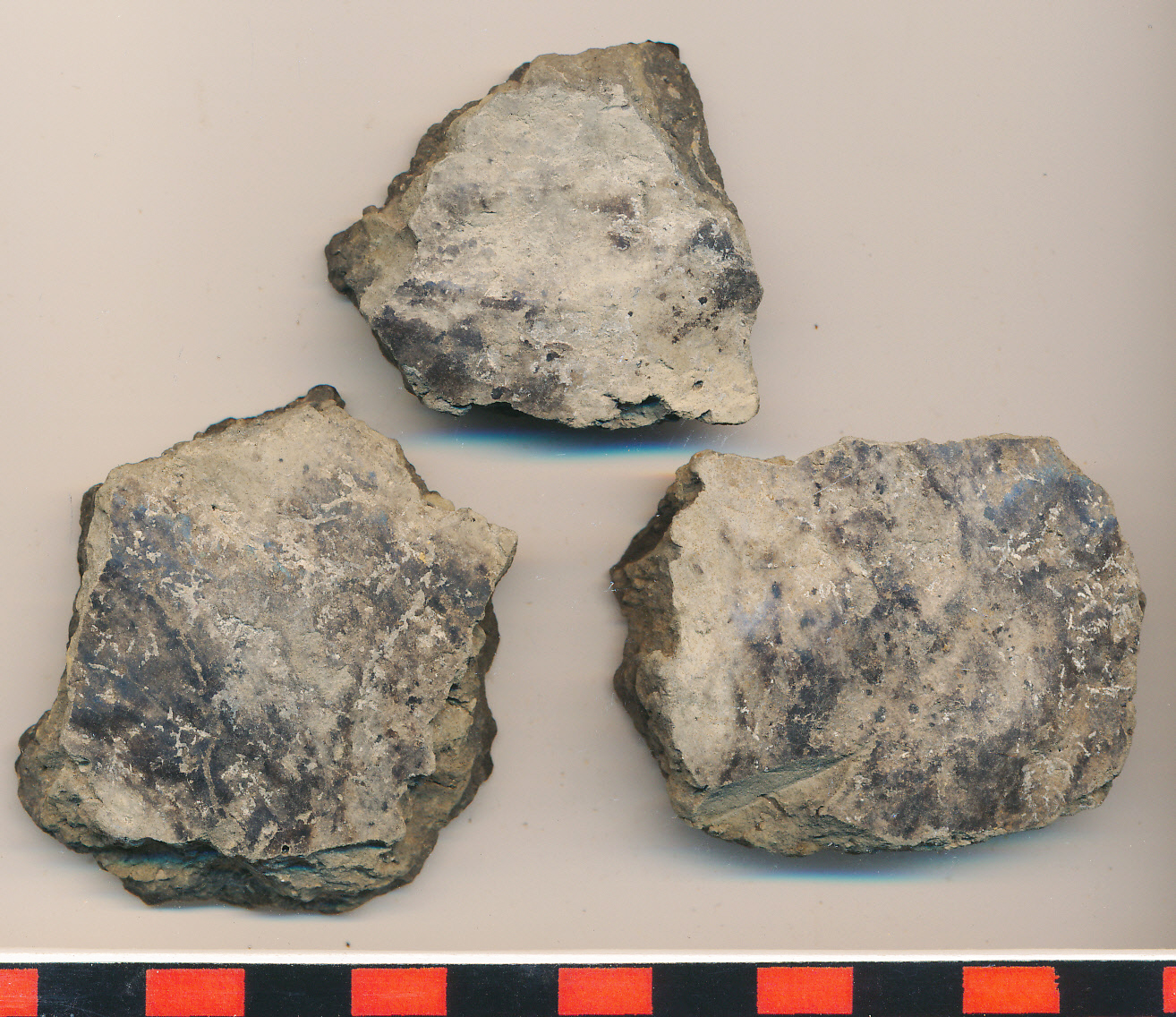 Fekete, belül eldolgozott, kívül fényezett, szürke foltos felületű, kerámiazúzalékkal soványított oldaltöredékek.