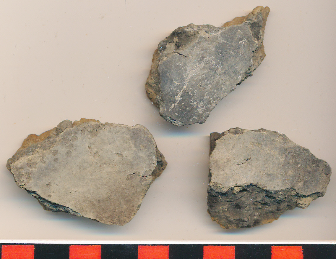 Fekete foltos sötétszürke külsejű, belül sárga felületű, fekete törésű, kerámiazúzalékkal soványított, jellegtelen oldaltöredékek.