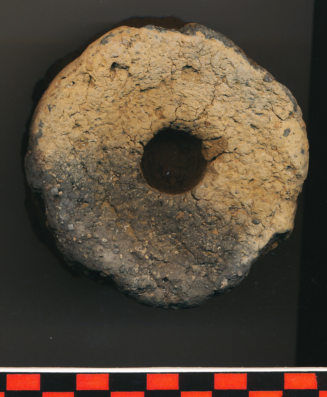 Világos sárgás téglaszínű, fekete foltos, fekete törésű, kerámiazúzalékkal soványított, korong nélkül készített nagy fedő, felülről benyomott fedőfogója.