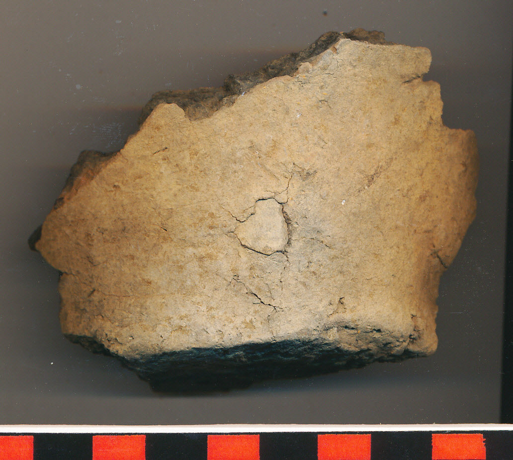 Alján és belsejében fekete foltos, kívül-belül téglaszínű, fekete törésű, kerámiazúzalékkal soványított, korong nélkül készített edény vágott aljtöredéke a vékony falú felmenő, eldolgozott felületű oldal indításával. Egy helyen nagy kerámiaszemcse van benne.