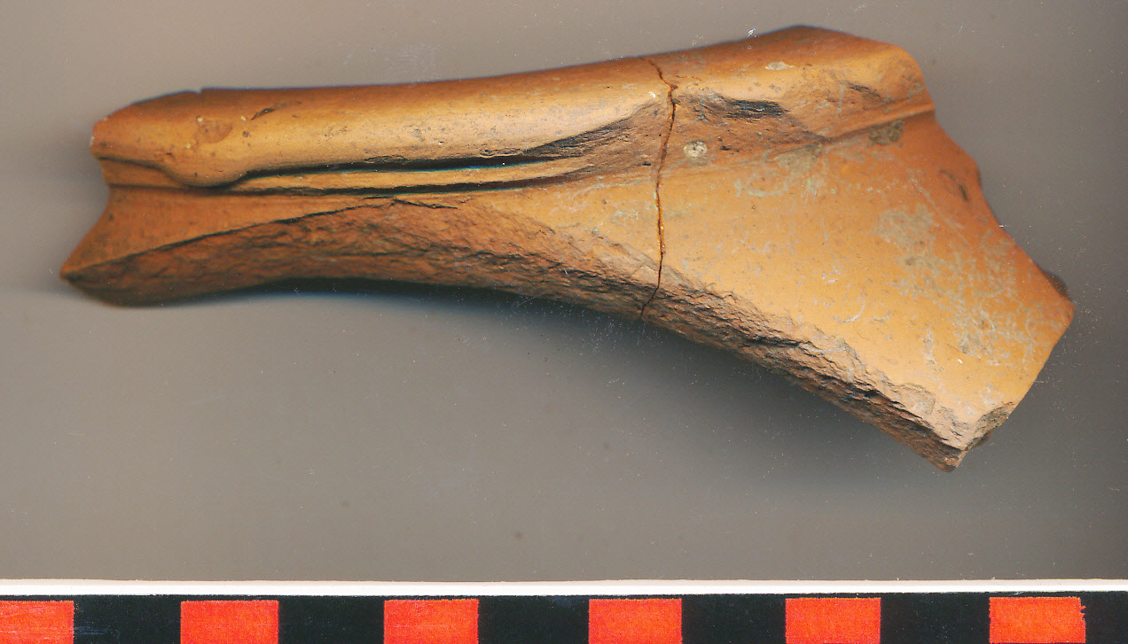 Élénk téglaszínű, korongolt, vízszintesen kihajló peremű, meredek vállú, simított felületű töredék 2 db-ból ragasztva.