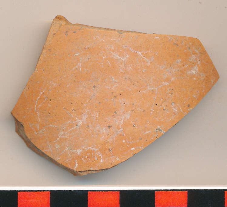 Élénk téglaszínű, korongolt, vízszintesen simított oldaltöredék.