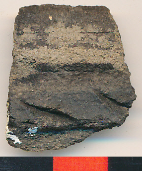 Fekete foltos világosszürke külső felületű, fekete törésű, homokos anyagú, korongolt edény kihajló, vízszintesen vágott pereme az íves nyak indításával, melyen ferdén mélyen bevágott vonalkákból álló körbefutó dísz jelentkezik.