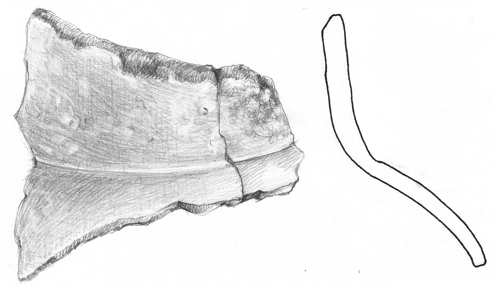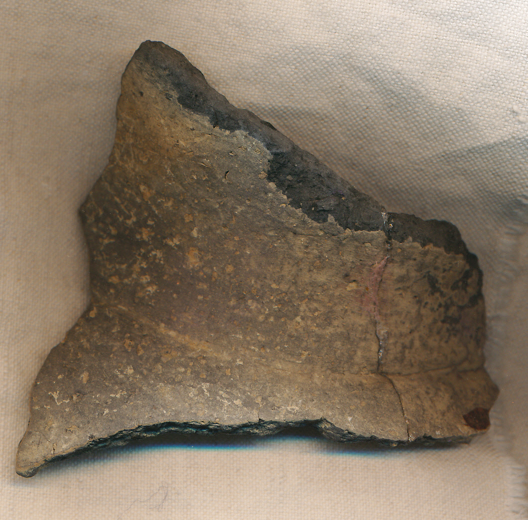 Kívül eldolgozott barnásszürke felületű, fekete törésű, vékony falú edény csonkakúpos nyak- és attól tagoltan elváló íves válltöredéke.