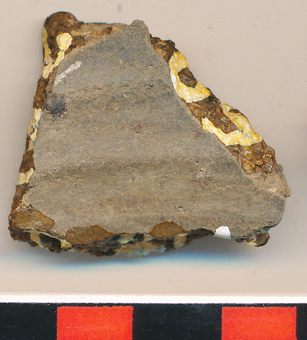Drapp, kerámiazúzalékkal soványított, függőlegesen kannelúrázott, vékonyabb falú oldaltöredék.