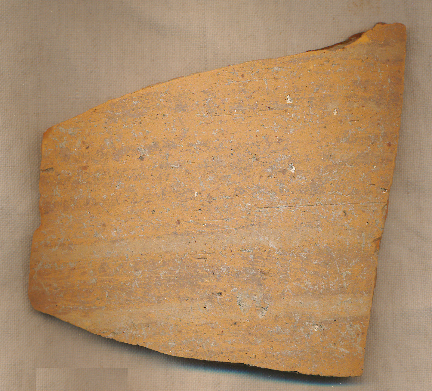 Téglaszínű, szürke szendvicses törésű, korongolt nagyobb edény (hombár?) külső felületén sávosan simított íves oldaltöredéke. Valószínűleg az előbbi töredéke.