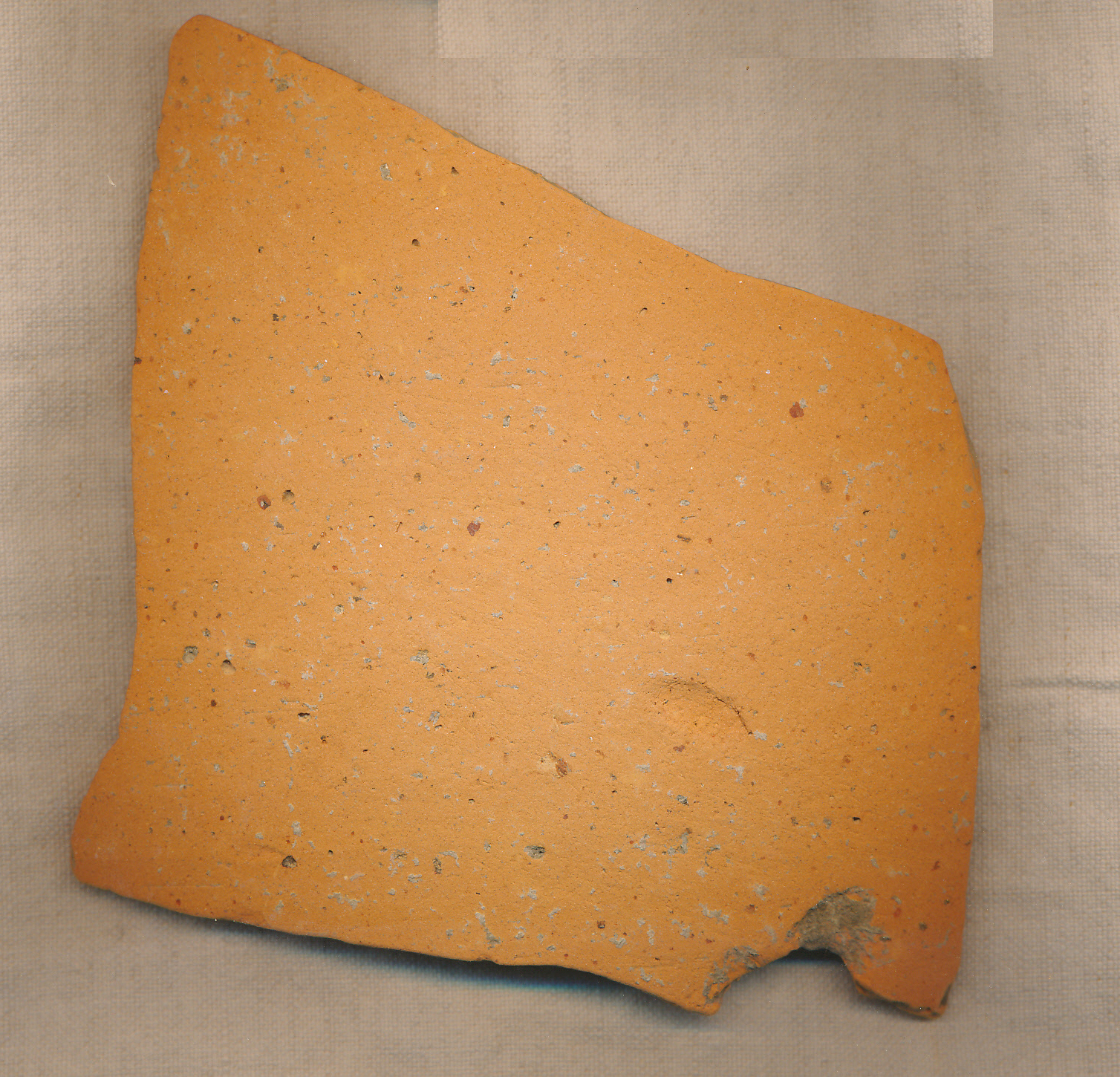 Téglaszínű, korongolt nagyobb, vékony falú edény íves oldaltöredéke.